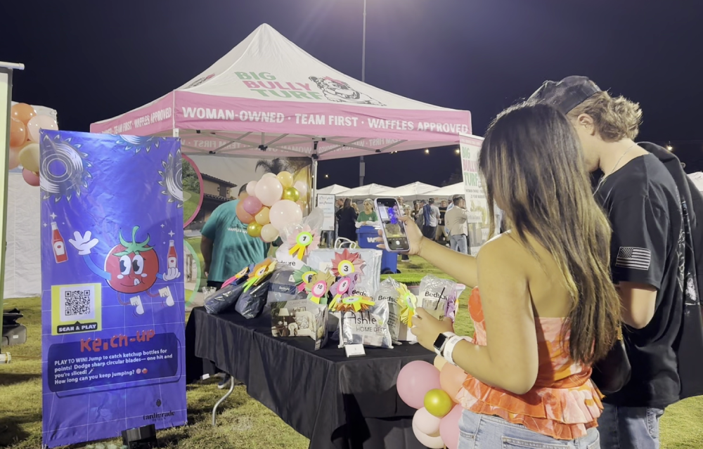 A beverage brand prints “Scan to Beat the High Score” on its booth banner. Visitors play a 30-second game and compete for a prize announced every hour.